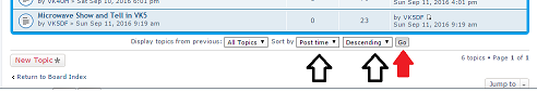 vk5awp Wrote:Would it be possible to have all the posts to come up in descending order , so the latest posts are at the top of the page. If you access any one major topic, expand the list and you should see the following near the bottom... Topics.... ___________________________________________________________________________________ Display topics from previous: ALL TOPICS Sort by: POST TIME DESCENDING Go Make your selections (particularly change Ascending to Descending) then press the GO button and it should still be true for the next time you log in.