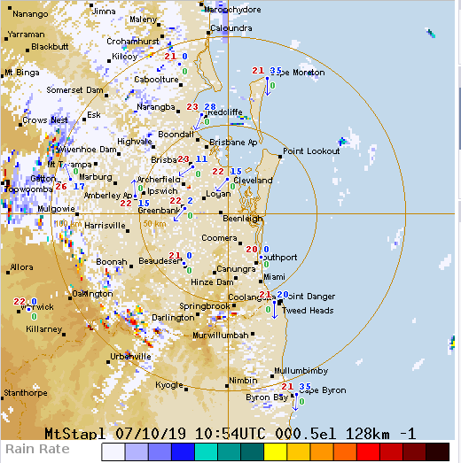 Weather radar image Bris 7Oct19 - VK4ADC - 07-10-2019 I was keeping an eye on the BOM Mt Stapylton RADAR tonight and was seeing sweeping arcs of patterns - interesting enough to grab a screen print. Not rain either, varying sweep to sweep. It made me wonder whether there were still some temperature inversions hanging about after a very hot day.. about 35-36 Celsius here earlier today.