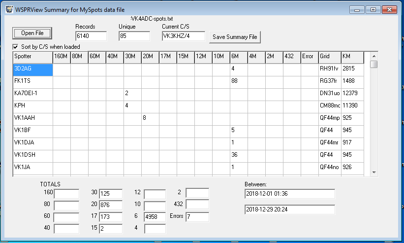 The new version has a feature that may prove of interest to those who run WSPR beacons themselves. It allows a download of only 'spots' to match the MyCall detail ( ie with /mycall=VK4ADC on the command line) so that you can assess who is actually reporting your transmissions. That function adds any new entries to your 'spots' and into the MyCall log file so that you can get a 'total log' even when WSPRView is not running.