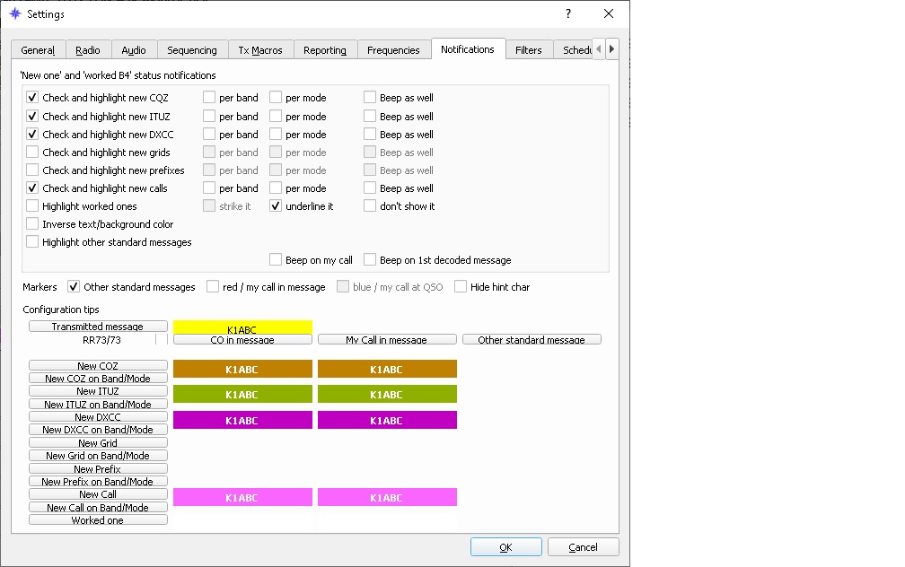 On that File > Setting > Notifications page ... in Configuration tips click on the button "CQ in message". I am almost certain you will find that white is selected. Try selecting any of the darker shades in 'Basic colors' ... click OK and see what you get (might need to restart JTDX ??) Cheers, Bob