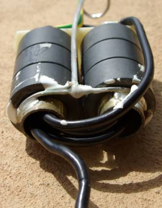After my last caravan trip, I set about building up a multiple ratio UN-UN to use with my 7M long wire squid pole style antenna. I used a FT140-61 toroid with quadrifilar windings and where the joints between the windings are, those points were taken to separate connection point screws on the ABS box housing. That gave me ratio points of 4:1, 9:1 and 16:1 that I could attach the antenna wire end to via a crocodile clip. The earthy side of the assembly connected to the coax connector and thence to the caravan frame via a second croc clip and braid.