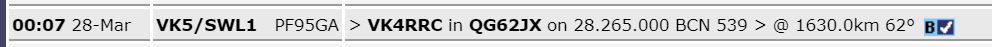 I had my 706 on 28264.4 USB while I travelled up to the Q'tech Conference/RedFest event last Saturday(22 4/17) and heard the beacon at its strongest while right at the top of the Gateway Bridge. It was audible all the way up to the Caboolture venue for me from then, varying strengths as expected for mobile operation. Antenna was a 5/8ths 2 metre whip, 706 via an LDG Z100 auto ATU, so efficiency not great.