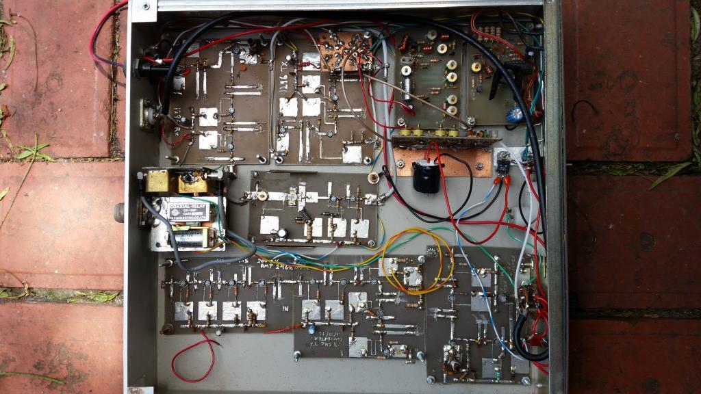 Here's an example of a homebrew 23cm and 13cm transverter from the 1980's. This was based on a design by YU3UMV published in VHF-Communications 1986. The boards are fiberglass drawn freehand with a Dalo pen then etched. I count 23 x BFG96 transistors and a TP3020A in the 23cm PA. There are two crystal oscillators (one for each band) running 30MHz and 32MHz crystal multiplied to 540MHz & 576MHz. Separate TX & RX converters take the appropriate LO and multiply for 144MHz in/out. Oscillator and TX/RX switching is done with PIN diodes and is controlled by RF sense from what the author called a VOX board, not sequencer as we do today. This builder removed some of the PIN diode switching and replaced it with a To Tsu (Tohtsu) relay. Next to the relay is a dual band stripline RF detector for reading TX power. Just consider the effort and commitment both in time and dollars this fellow went to get on these bands. It's a lot different today. I've posted this in several places basically for the sake of posterity because it will soon disappear from FB.