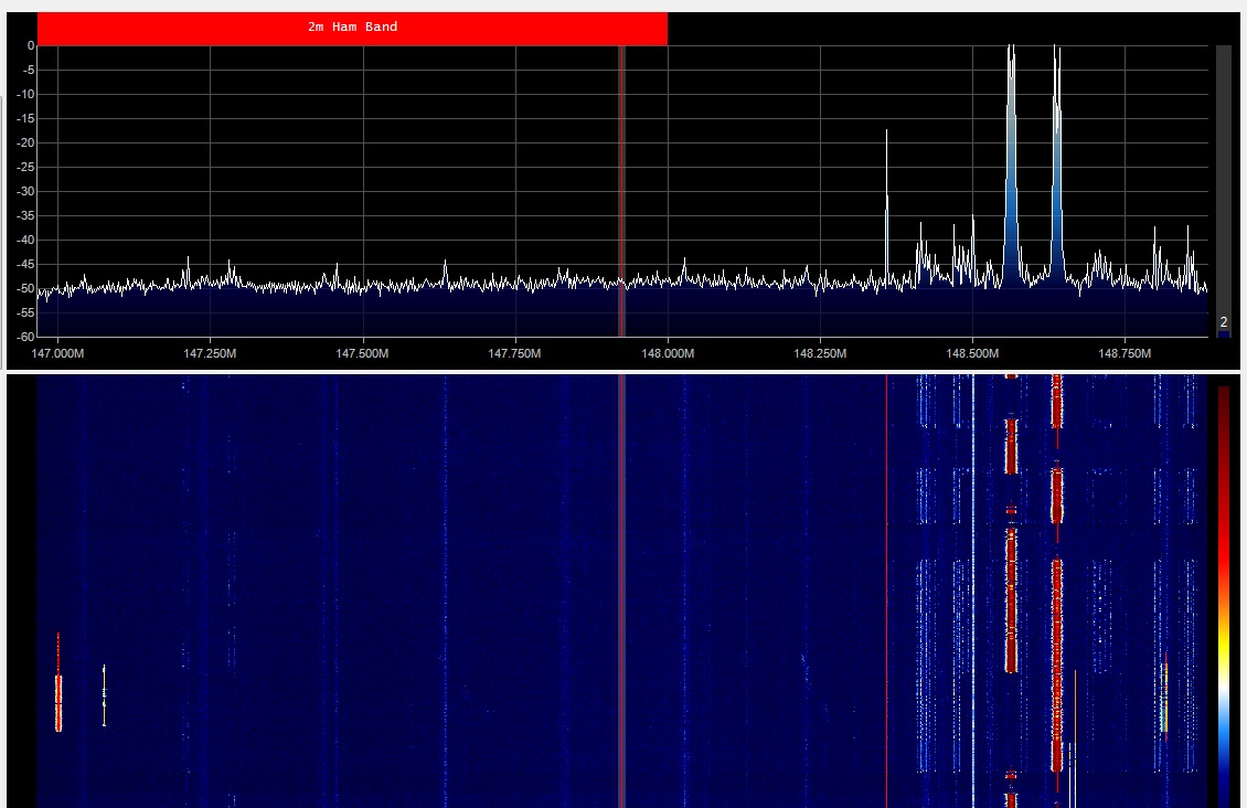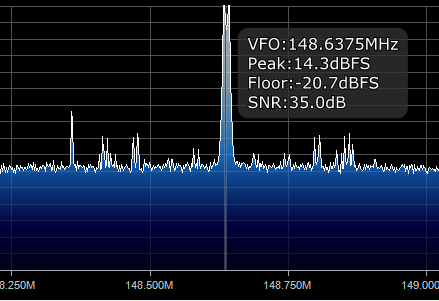 I tried SDsharp as the spec analyser today after noting paging tones come over the top (partial FM capture) of some users on VK4RAX (Rx 147.675), still with the attenuator in-line and adjusted to prevent overload. Vertical graticule is 5dB steps (approx).