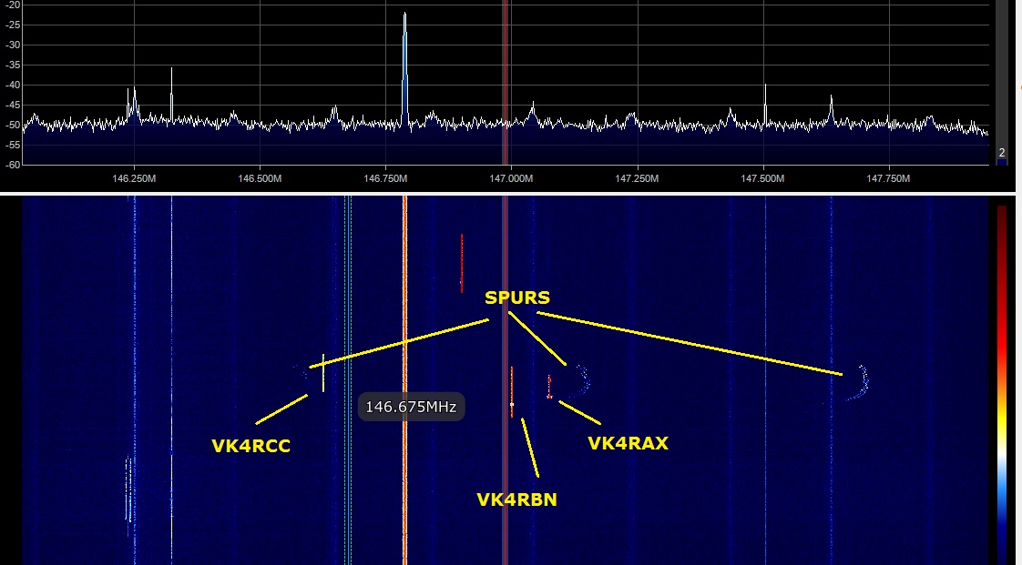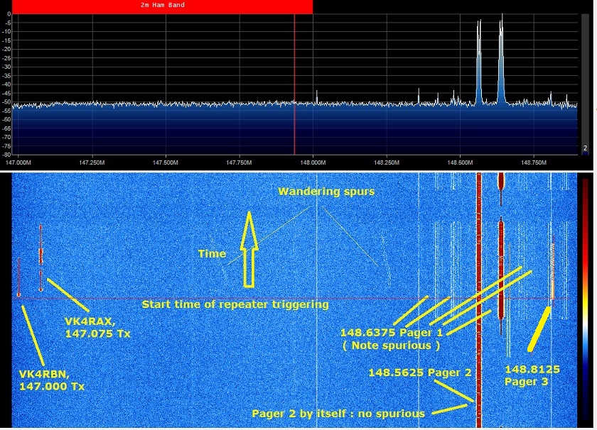 I have been looking into some pager-sourced QRM which is causing triggering of a number of 2M repeaters in SE Qld, notably those which don't require an access tone. VK4RBN on 147.000 (Tx, Rx 146.400), VK4RAX on 147.075 (Tx, Rx 147.675) being the most obvious ones plus I suspect that the Dstar repeater VK4RBX on 146.7875 (Tx, Rx 146.1875) is also being hit as well. I have been using my SDR plus two receivers to isolate the most likely source to being 148.6375 but there are so many paging transmitters on it that pinpointing which individual Tx is faulty is hopeless.
