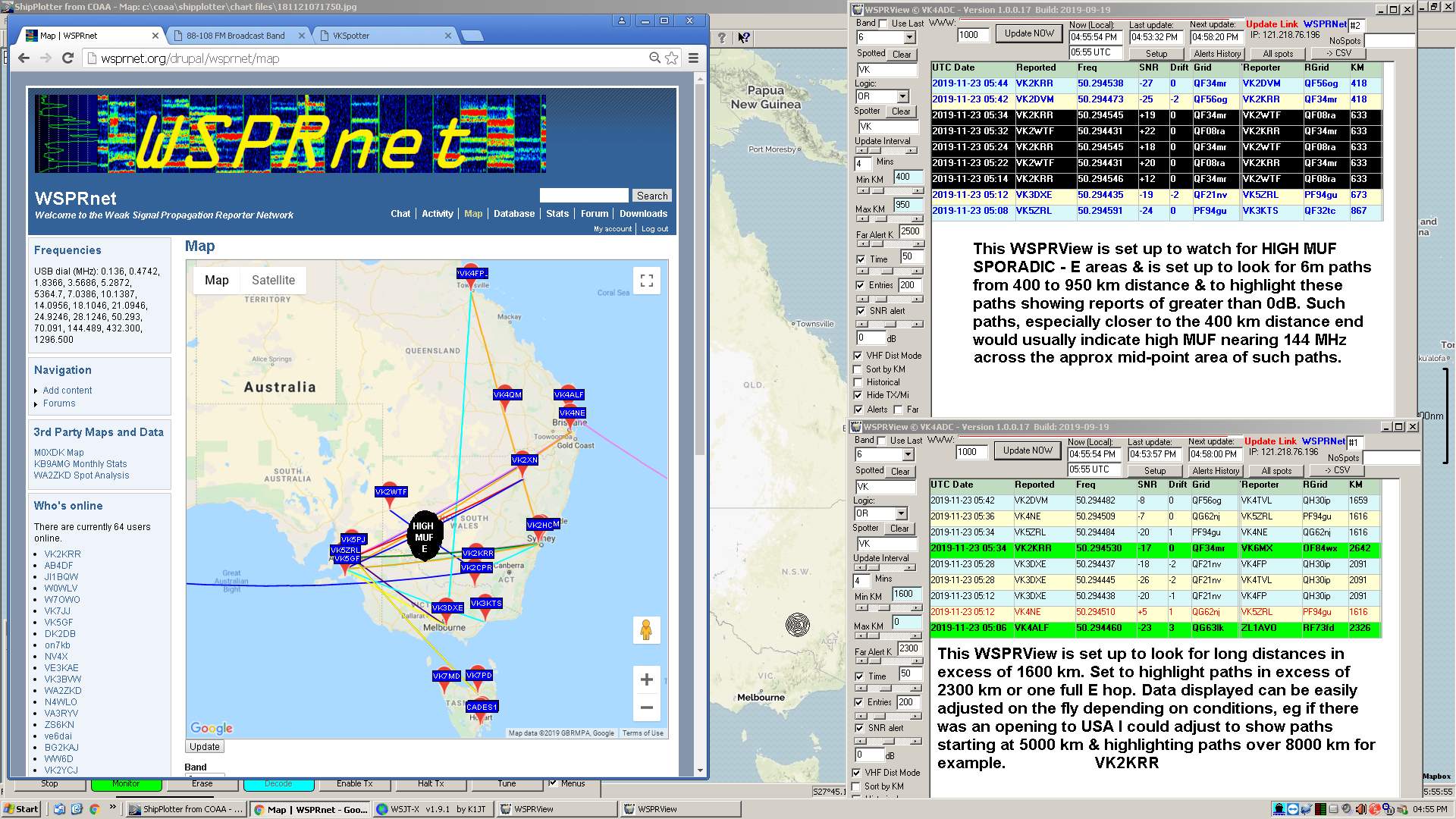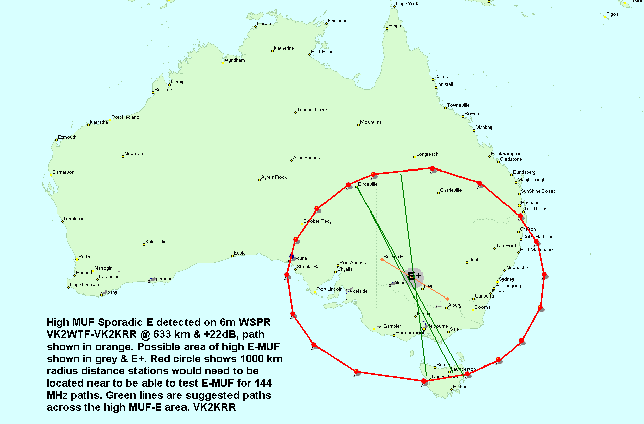 If you look at the attached images you can see that while a 2m path may have been possible across the high MUF area of VK2WTF and VK2KRR, there were no stations in good alignment to be able to test the MUF at 144 MHz. If there was stations on 144 MHz around Birdsville area, then some tests could have been conducted from stations in Tasmania, and Tasmania is the only area from which this path could have been tested, unless the E MUF was very strong in which case stations may be been able to work as little as 1000 km paths if they lined up across the high MUF area. I'll add more info in each photo description.