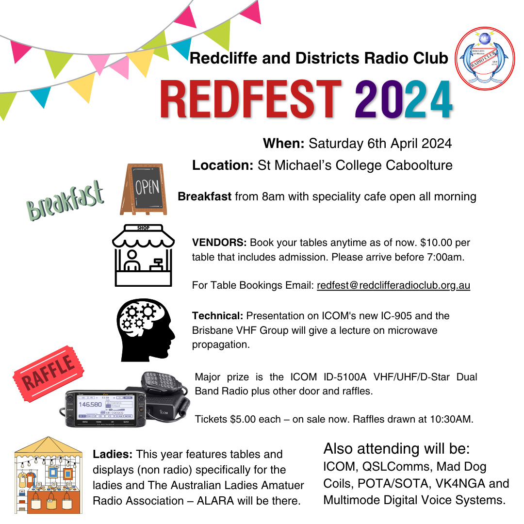 Prizes! Raffle prizes are always attractive items at Redfest and this year is even better with the ICOM ID-5100A VHF/UHF FM and digital transceiver as the main prize. There will also be minor prizes as well as hourly lucky door draws.