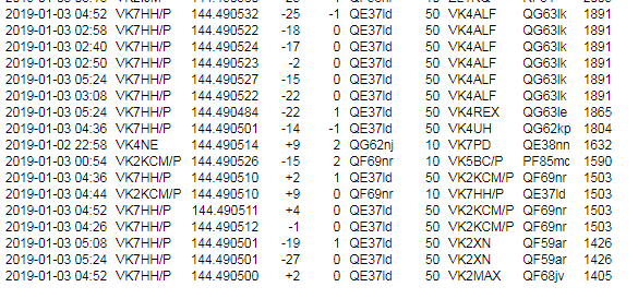 2019-01-04 22:48 VK4NE 144.490528 -17 0 QG62nj 10 VK7HH/P QE37ld 1785 SprE