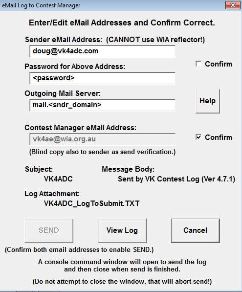 If yes, then the next step is to send in your log. VKCL 4.7.1 provides the feature to submit your log but I am a bit nervous about putting my email password in the setup form. The screen below shows the setup form but mail host details and account passwords are not readily going to be supplied by me even if only stored on my PC. The other (better ?) option is to send an email to VK4AE from your email software, subject is just your callsign, and attach the text export log file.