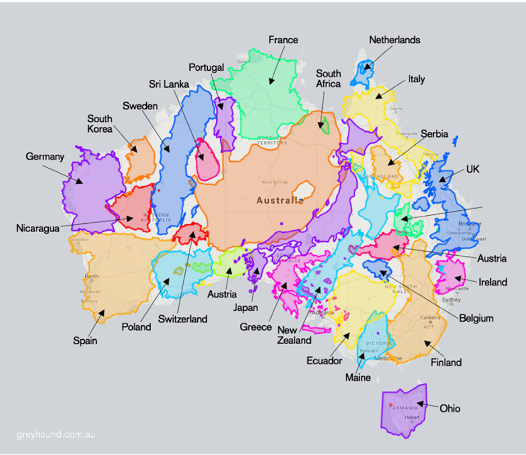 A discussion at lunchtime today about travelling in other countries and the distances we are used to - and many others aren't - was highlighted by a graphic I spotted on Facebook just after I arrived home. I tried to find it on the greyhound.com.au web site to link to it but failed miserably. Accordingly I did a screen print to file and have added it below.
