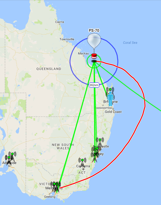PS-70 - VK5EI - 21-01-2017 Information received from Andy this afternoon posted on this forum for interested trackers ![]() Hi, PS-70 is planned to be released on Sunday 22 Jan 2017. Solar powered party balloon, 25mW TX TX WSPR, JT9 on 30m Dial frequency 10.138700Mhz (standard WSPR dial frequency) for WSPR, JT9. JT9 is at 1650Hz on the waterfall. See HF decoding info at http://picospace.net/?cat=34 Tracking as PS-70 on SNUS http://tracker.habhub.org/#!mt=roadmap&mz=6&qm=All&f=PS-70&q=PS-70 WSPR call sign is VK3YT http://wsprnet.org/olddb?findcall=vk3yt TX scheduling Minute - Band - Mode - Condition :00 - 30m - 2 mins WSPR then two x 1 min JT9 - mandatory :10 - 30m - 2 mins WSPR then two x 1 min JT9 - if batt full :20 - 30m - 2 mins WSPR then two x 1 min JT9 - if batt full :30 - 30m - 2 mins WSPR then two x 1 min JT9 - mandatory :40 - 30m - 2 mins WSPR then two x 1 min JT9 - if batt full :50 - 30m - 2 mins WSPR then two x 1 min JT9 - if batt full It looks like the balloon will be a hanging around Australia for a couple of days. Assistance with tracking is appreciated. Regards, Andy Re: PS-70 - VK4ADC - 23-01-2017 Tracking pretty close to anticipated path so far...