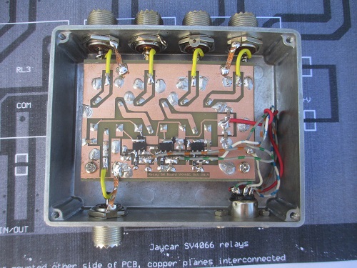 RE: Coronavirus isolation project activities in the hamshack.. - VK4ADC - 13-04-2020 My rotator project is finished... Next coronavirus-isolation project ?? The relay box component PCB was exposed, etched, drilled and built up on Saturday, put into a diecast box yesterday, then tested and mounted on the shack wall in place of a 4 position Daiwa coax switch. Late in the day I was switching between my main HF antennas as I moved band-to-band, rotating the HF yagis as desired, looking at the waterfall of FT8 signals. I made a few contacts on 10.1 MHz (30M), mainly into Europe and the USA so all is working well. Here are a few images of the relay component..