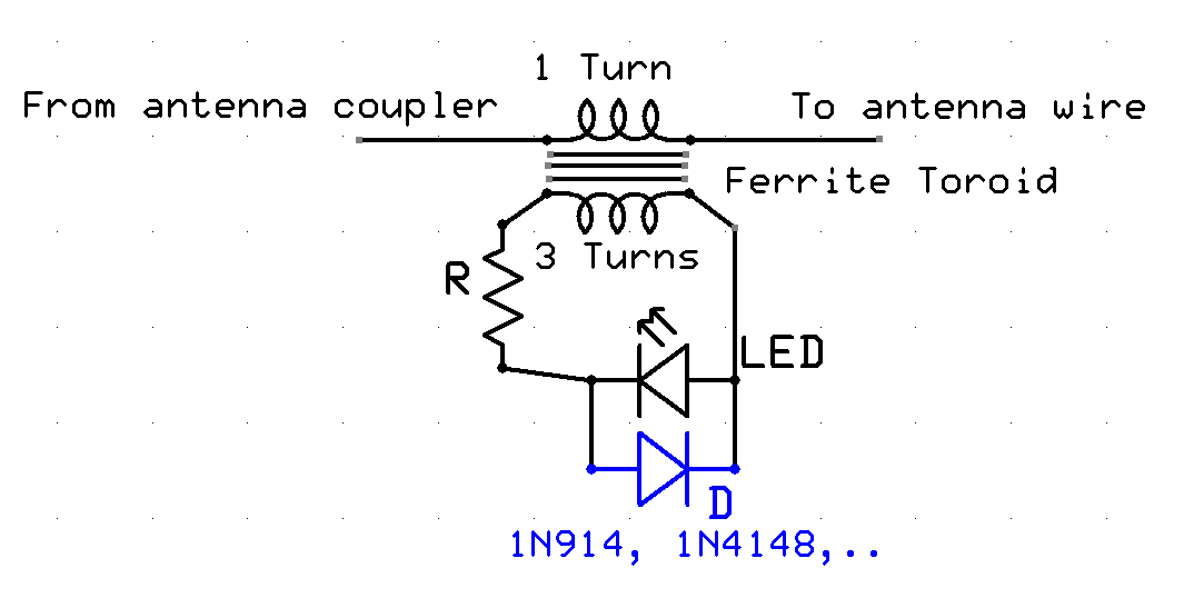 The problem arises when there is RF power substantially higher than Peters typical transmitter power of 5 watts or 10 watts. The schematic reveals that there is essentially a 1 turn primary to 3 turn secondary current transformer in series to the antenna wire. The LED is wired directly across the secondary winding BUT two extra components should have been added... a diode and a resistor.. so that it can cope with higher power levels.