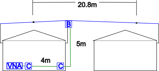 The proximity of the wire components to the large metal shed roofs will also contrbute extra capacitance (effectively to ground) where in a truly free-up-in-the-air mounting, that capacitance would be far lower.  The effect : lower resonant frequency.