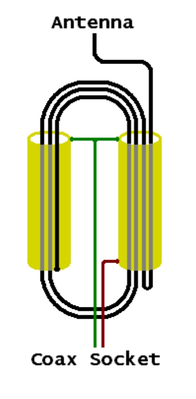 The twin tubes within the two rows of ferrites is a well known technique  and described in many articles on the web, and even one that appeared in AR magazine within the last few years.  Solid state PA output stages have been using it for many years (>20) particularly for push-pull outputs where the transistor output impedance is so low and is essentially the multiple turns through the sleeves are just a wide-band impedance step up transformer.   The one in the Iain's diagram looks to be basically a 1:3 turns ratio so about 1:9 impedance transformer, ie 50 : 450 ohms.   The top of the transformer connects to the vertical radiator hoping that at any applied frequency, the feed impedance will be somewhere approximating 400-500 ohms - which will only occur at a relatively few frequencies within the HF range.