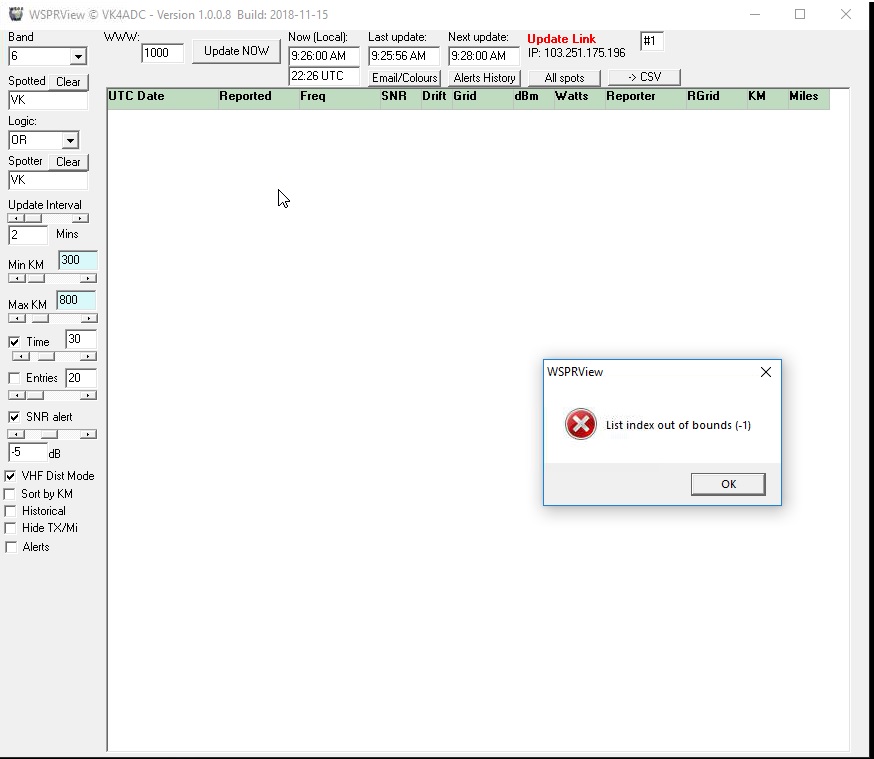 As mentioned on the WSPRView web page, there has been a lot (and I mean a lot, days upon days) of change happen inside WSPRView since V1.0.0.7 was released   The data is manipulated in stringlists which have indexes and that error relates to a stringlist pointer trying to be set to an invalid data location. Problem is there are multiple lists used in the software all of the time and finding out which one is raising the error is the key.  Even the displayed data grid is a stringlist !