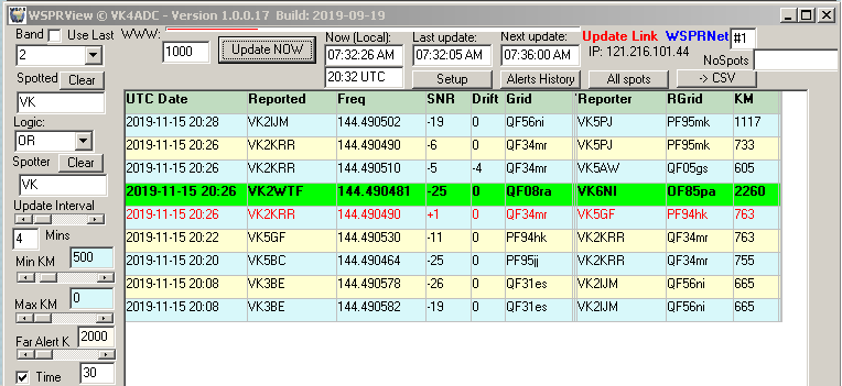 The new version has a feature that may prove of interest to those who run WSPR beacons themselves. It allows a download of only 'spots' to match the MyCall detail ( ie with /mycall=VK4ADC on the command line) so that you can assess who is actually reporting your transmissions. That function adds any new entries to your 'spots' and into the MyCall log file so that you can get a 'total log' even when WSPRView is not running.