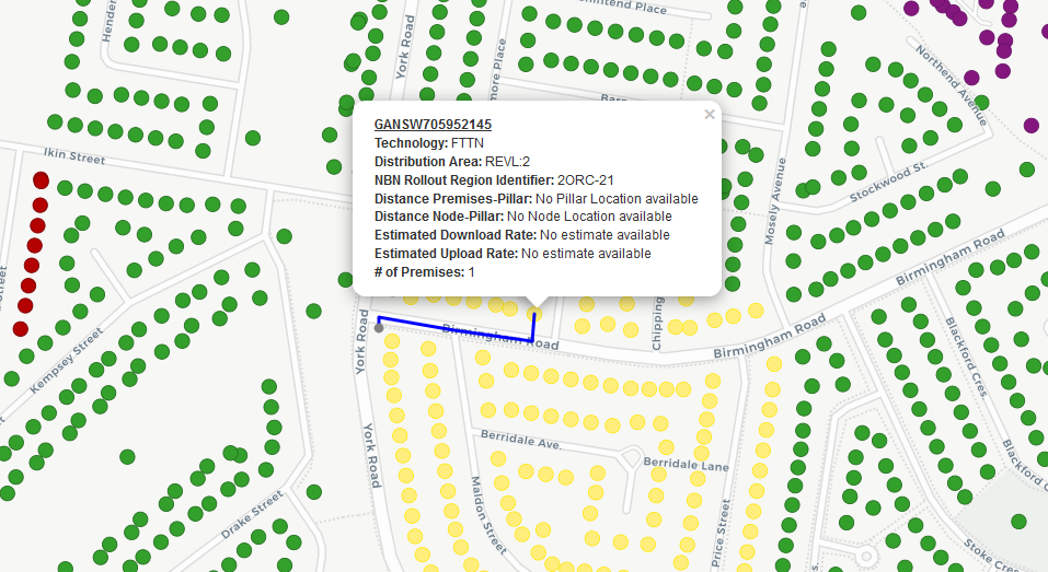 Zoom into your are and you will see what type of connection is available and what its expected speed is and for those of you on FTTN it will draw a line to the node you are connected to!