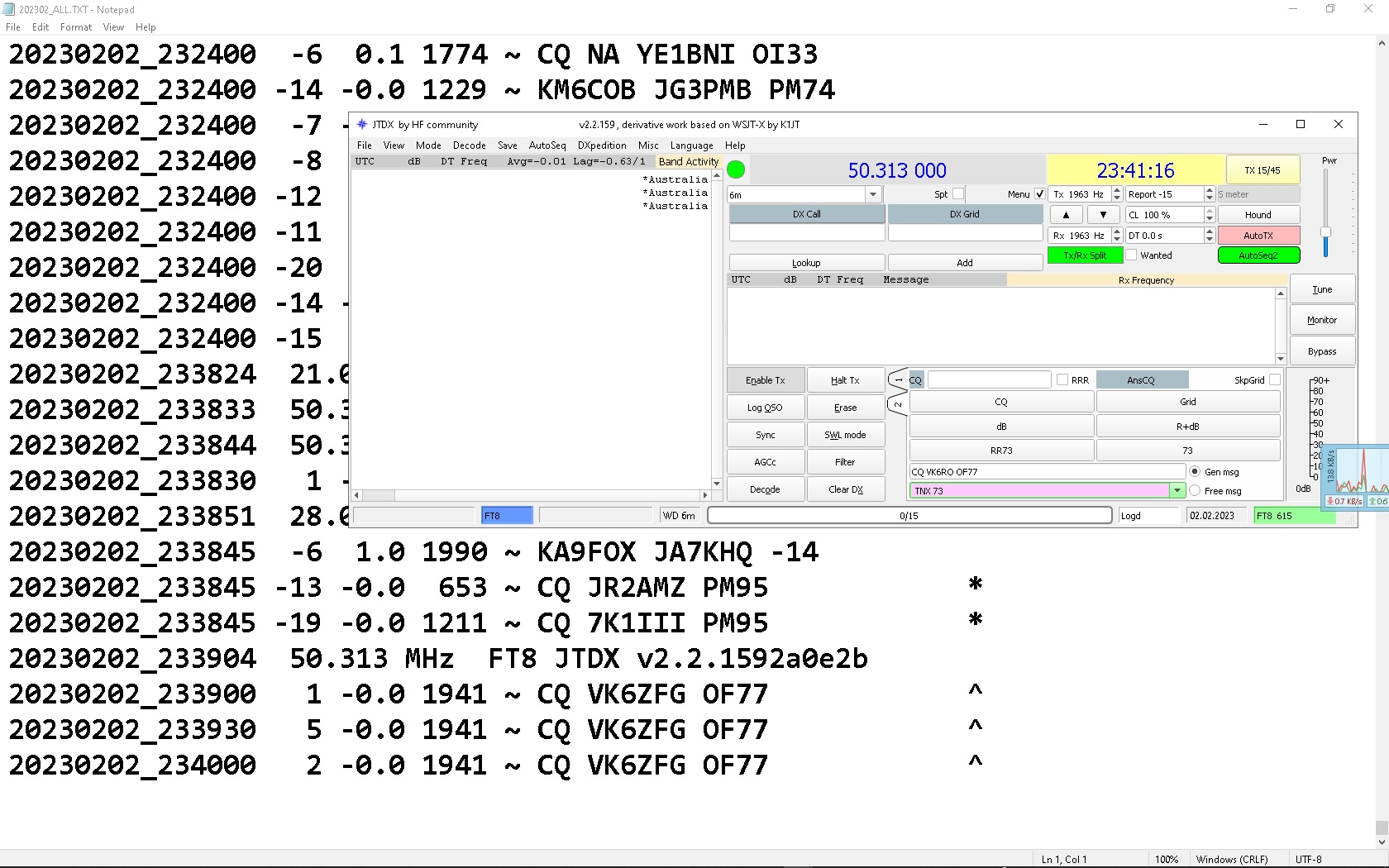 The lines below match the jtdx program lines in some i managed to catch. The print screens are just examples Thank you EXAMPLE of JTDX blank line feb 3 2023 This log extract coincides with the jtdx program where blank lines are. There is a few more from this morning Maybe look at the attached txt file in full screen 20230203_004830 -13 0.2 1874 ~ JA3XJF VK6OX 73 ^ 20230203_004830 -13 0.6 1716 ~ VK6ZFG JJ1NLR -15 20230203_004847.413(0) Transmitting 50.313 MHz + 1963Hz FT8: CQ VK6RO OF77 20230203_004900 -5 0.2 346 ~ VK8AW JA1MLY -07 ^ 20230203_004900 -2 0.4 2267 ~ VK6ZFG JA2BTV PM85 20230203_004930 -12 0.3 1327 ~ VK6ZFG JA7EVP -07 ^ 20230203_004951.095(0) Transmitting 50.313 MHz + 1963Hz FT8: JG1RVN VK6RO R-05 20230203_005000 -1 0.2 2101 ~ VK6ZFG JR3UPT PM74 ^ 20230203_005000 -5 0.3 962 ~ VK6RO JG1RVN -11 20230203_005030 -6 0.2 1286 ~ VK6ZFG JO1LVZ -20 ^ 20230203_005045.091(0) Transmitting 50.313 MHz + 1963Hz FT8: JG1RVN VK6RO 73 20230203_005058.883(0) QSO logged: JG1RVN 20230203_005100 -3 0.3 962 ~ VK6RO JG1RVN RR73 20230203_005100 -8 0.3 1872 ~ JR7COP VK6OX -16 20230203_005130 -12 0.2 1498 ~ VK6RO JE6KYA -15 20230203_005130 -11 0.2 2044 ~ VK6RO JF2MBF -13 20230203_005145.142(0) Transmitting 50.313 MHz + 1963Hz FT8: JF2MBF VK6RO R-11 20230203_005200 0 0.3 644 ~ VK6ZFG JM1SZY -13 20230203_005200 -2 0.2 2642 ~ VK6ZFG JR3UPT -13 20230203_005230 -13 0.2 1498 ~ VK6RO JE6KYA -10 20230203_005245.189(0) Transmitting 50.313 MHz + 1963Hz FT8: JE6KYA VK6RO R-13 20230203_005300 0 0.3 998 ~ VK6ZFG JM1SZY -12 20230203_005300 1 0.2 2395 ~ VK6ZFG JF2MBF -16 ^