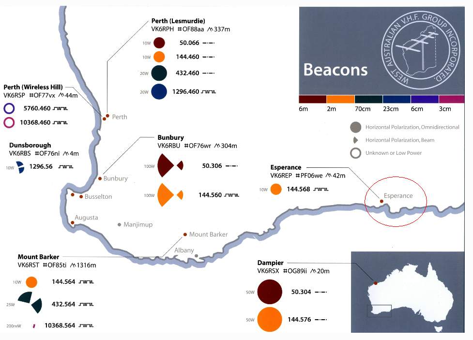If anyone is able to set up beacons at Esperance WA (VK6) that would be much appreciated by many on the east side of Australia. It is not only within a single Sporadic E hop for some, but also tropo signals are always possible and more likely than Albany. CW or WSPR would be preferred, or both even better.